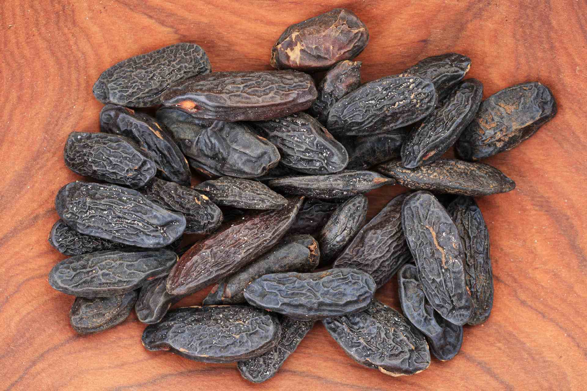 Ernte: Nach der Ernte der Früchte werden diese aufgeschnitten und der Kern, also die Tonka-Bohne, entfernt. Ihr besonderes Aroma entwickelt sich jedoch erst durch einen Fermentationsprozess, welcher das Einlegen des Kerns in Rum für einige Tage erfordert. Im Anschluss wird die Tonka-Bohne getrocknet und entfaltet so ihren betörend süßlichen Duft.